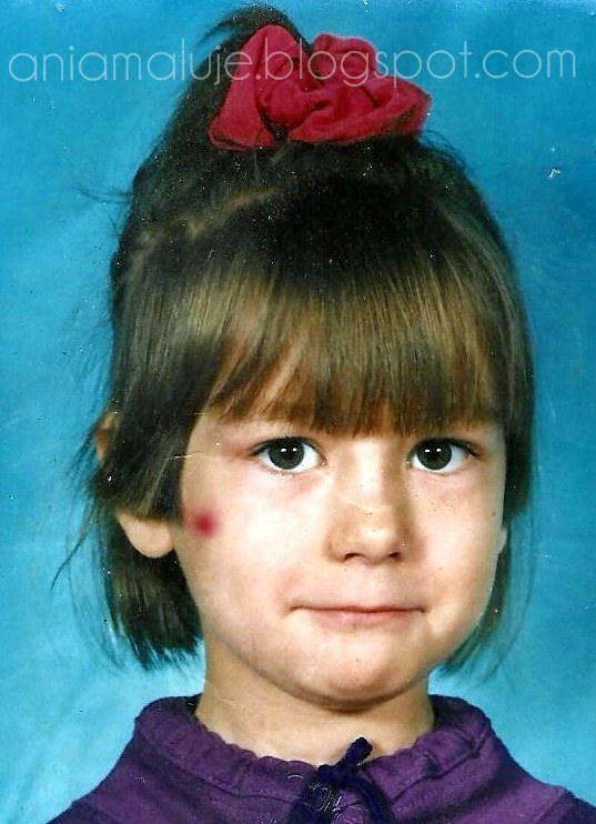 Pierwsza w życiu wizyta u fryzjera nie należała do udanych. Wiek : 4 i pół. Poprzednia długość – mocno za łopatki. Pamiętam do tej pory, że usiłowałam za wszelką cenę nie zrobić uśmiechu do zdjęcia, żeby mama go nie kupiła, bo fotograf był niemiły 😀  Oczy i kąciki mi się śmieją, bo nie udało mi się powstrzymać szaleńczego uśmiechu spowodowanego genialnym planem :)! Pamiętam to bardzo dobrze, bo za każdym razem kiedy w podstawówce/gimnazjum/liceum itp. były zdjęcia waliłam “szneki”. W imię zasad :))