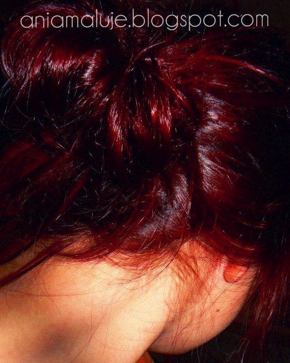 W tym przypadku poszła w ruch farba  w tubce “henna venita” owoc granatu. Nie wiem jakim cudem załapało na mocno ciemnych popłuczynach fioletu, ale  uwielbiam blask i błysk jaki nadaje ta farba.