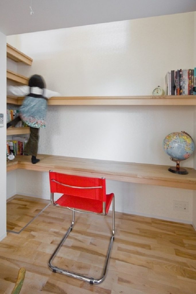Ten kącik całkiem mnie uwiódł – bardzo fajnie wykorzystana mała wnęka. No, może nie podobają mi się pierdółki na półkach, ale oświetlenie biurka i miękkie siedzisko zdecydowanie na plus 😉