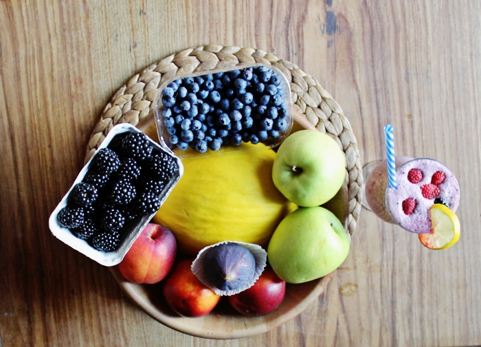 Dzienna porcja owoców : opakowanie jeżyn i borówek, figa, dwa jabłka, 3 nektarynki, garść malin, ponieważ jest solidna