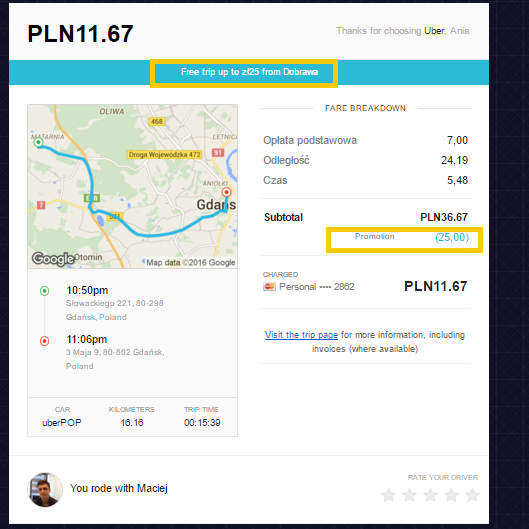 Normalnie zapłaciłabym z lotniska na dworzec pks 36,67 (w uberze, taksówka w taryfie nocnej boli po kieszeni mocniej) – z kuponem ściągnęło mi z konta tylko 11,67 zł i  dojechałam na czas i bez spiny. Co ważne – w uberze nie mogą jeździć stare samochody, więc nie przyjedzie kierowca starym mercedesem śmierdzącym fajkami ;-). Nikt cię też nie orżnie, jak często robią “złotówy” z nieświadomymi turystami – po podróży dostajesz mapkę z trasą i jeśli uznasz że kierowca wiózł cię okrężną drogą – Uber zwróci różnicę. To informacja od kierowcy Macieja, którego oczywiście oceniłam na 5 – bardzo sympatyczny człowiek, polecam :).