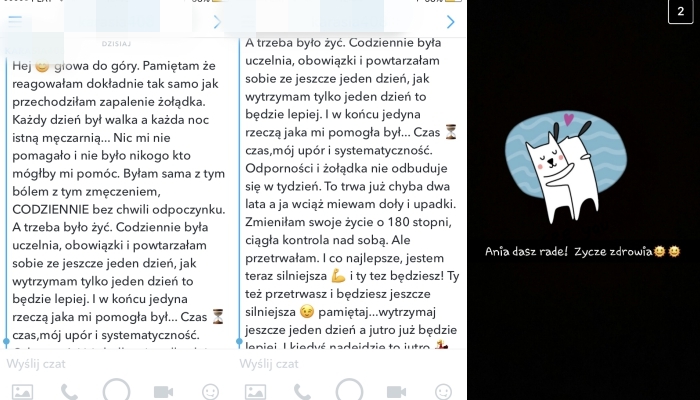 Okazało się, że czasami się gdzieś mijamy. Jechaliśmy jednym pociągiem, albo nawet byłam z kimś w jednej sali. Mamy wspólnych znajomych, ale głupio było zagadać. Napisało też do mnie sporo osób zmagających się z chorobami oskrzelowymi i innymi. I pisały, że dają radę dlatego, że ja pokazuję że się da. Dawno nic nie oczyściło mnie tak bardzo jak ten głupi płacz. Chciałam podziękować Wam za wsparcie, dało mi takiego kopa jak mało co.