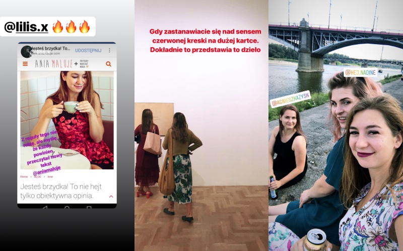 Wyżej widzicie Zuzę w galerii Zachęta. Wybrałyśmy się z Zuzą (i Dorotą, która niżej) na dwie wystawy. Czwartki są za darmo! Wrażenia – trochę mieszane. Ja mimo starań mam spore problemy ze zrozumieniem sztuki współczesnej. Moją opinię możecie przeczytać na instagramie. Jest tam też sporo ulotnych rzeczy, które wygasają zawsze po 24h, więc komu brakuje tekstów – musi nauczyć się śledzić mnie także na instagramie.