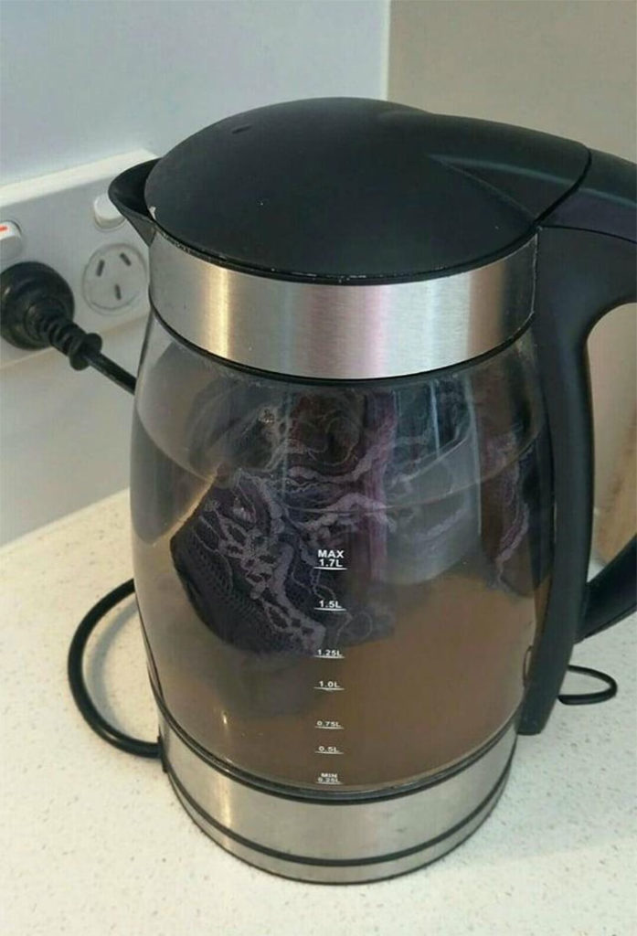 A to są majtki. W czajniku. Majtki kobiety, która była w hotelu, miała okres i nie miała zapasowych gaci, więc je wyprała. Tutaj więcej przykładów najgorszych gości hotelowych i w airbnb