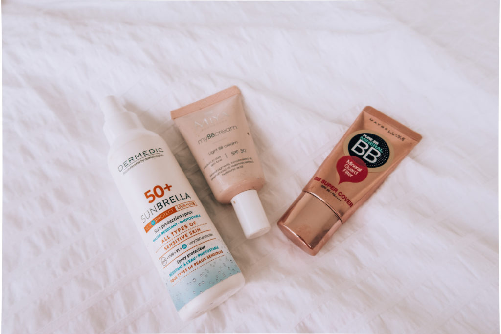Krok 1 to filtry, bez których nigdzie się nie ruszam. Mam filtr 50 w sprayu oraz dwa kremy BB – jeden z filtrem 30, drugi 50. Nie chciałabym mieć białej twarzy i opalonego ciała, więc ten skromny arsenał do makijażu załatwia sprawę. W moje ocenie Miya ma bardziej “europejskie” kolory, BB z Maybelline jest potwornie żółty. Ale też został przywieziony z Azji, więc się nie czepiam, chroni dobrze!