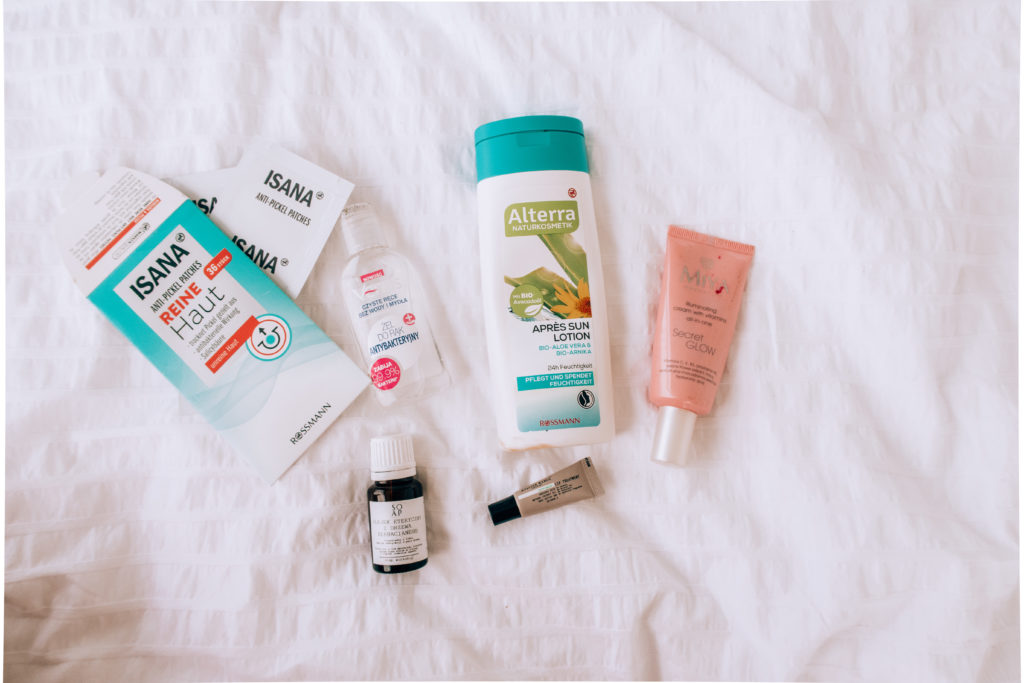 Do twarzy używam różowego kremu secret glow z Miya. Usta nawilżam malutkim balsamem, który dostałam podczas lotu Turkish Airlines. Na ciało nakładam codziennie kojący balsam po opalaniu z Alterry. Pachnie obłędnie! Jestem pielęgnacyjnym leniuszkiem, więc gdyby nie ten zapach, pewnie bym o nim zapominała. Uwielbiam zasypiać otulona wonią olejku migdałowego. Oprócz tego mam w kosmetyczce żel antybakteryjny (brudne paluchy na twarzy to proszenie się o krostki), przezroczyste plasterki do zakrycia ewentualnych niespodzianek (mają w składzie olejek z drzewa herbacianego, więc oprócz ochrony przed macaniem, przyspiesza także gojenie się). No i mała buteleczka samego olejku – pierwsza pomoc przy większych kłopotach!