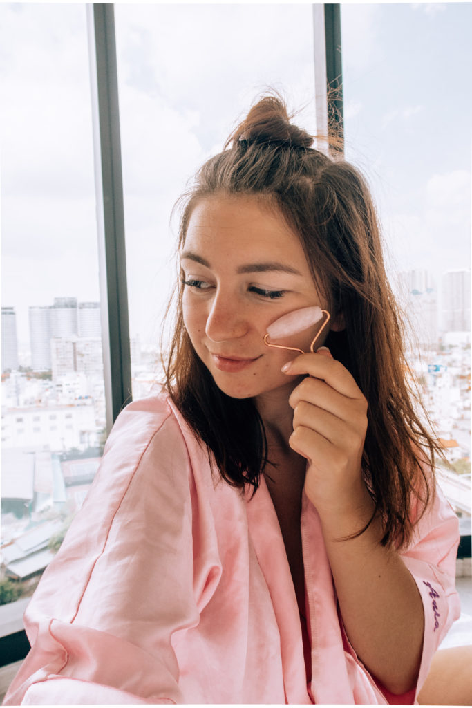 Lubię też pogładzić cerę rollerem z różowego kwarcu. W podróży stracił połowę rączki, ale nadal świetnie spełnia swoje zadanie. Masaż policzków jest bardzo przyjemny i odprężający! Jeśli chcesz kupić swój roller, z całego serca będę ci polecać różowy kwarc. Te jadeitowe są mocno wątpliwe etycznie. Przy wydobyciu tego minerału często pracują dzieci, nie polecam! (klik).