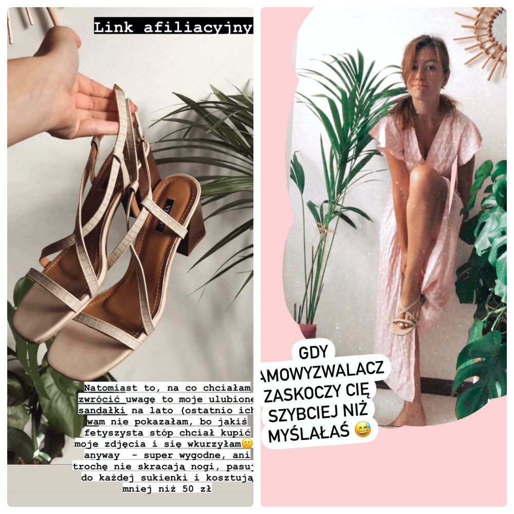 Druga para to beżowe sandałki na stabilnym obcasie, również z ukośnymi paskami. Wygodne, do codziennego chodzenia. Pasowały mi do każdej letniej sukienki. Podrzucam link – beżowe sandałki*