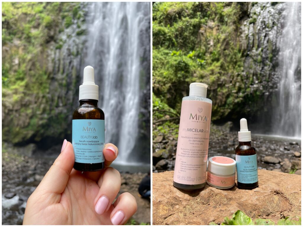 Serum nawilżające BEAUTY.lab z potrójnym kwasem hialuronowym sprawdza się w ekstremalnych warunkach. Miałam problemy żołądkowe i w podróży spotkała mnie biegunka. Mimo brania elektrolitów byłam odwodniona, a skóra bezlitośnie to pokazuje. Serum łatwo się aplikuje, błyskawicznie się wchłania i szybko widać efekty! Mam porównanie z poprzednich podróży i wiem jak moja skóra reaguje zazwyczaj na takie warunki. Tym razem jest naprawdę okej! Podejrzewam, że to zasługa połączenia trzech różnych wielkości cząsteczek – kwas hialuronowy w serum jest ultranisko, średnio i wysokocząsteczkowy. Najbardziej docenia to mój nos, który spaliłam słońcem na samym początku podróży. Jak wrócę, dokupię sobie mySKINbooster z peptydami, bo kosmetyki MIYA są bardzo przyjazne dla mojej wrażliwej skóry. No i szybciutko się wchłaniają, rach ciach i po sprawie! Ja mam bardzo suche czoło i nos.