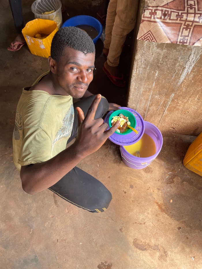 - Jem lokalną zupę urojo. Mnóstwo lokalsów się zleciało, bo mzungu jedzą zupę. Będzie im smakować? Każdy nasz ruch bacznie obserwowany. Zupa nalewana z wiaderka, pytam, czy mogę zrobić zdjęcie. “Tak, ale tylko jak ja na nim będę”. Proszę uprzejmie!