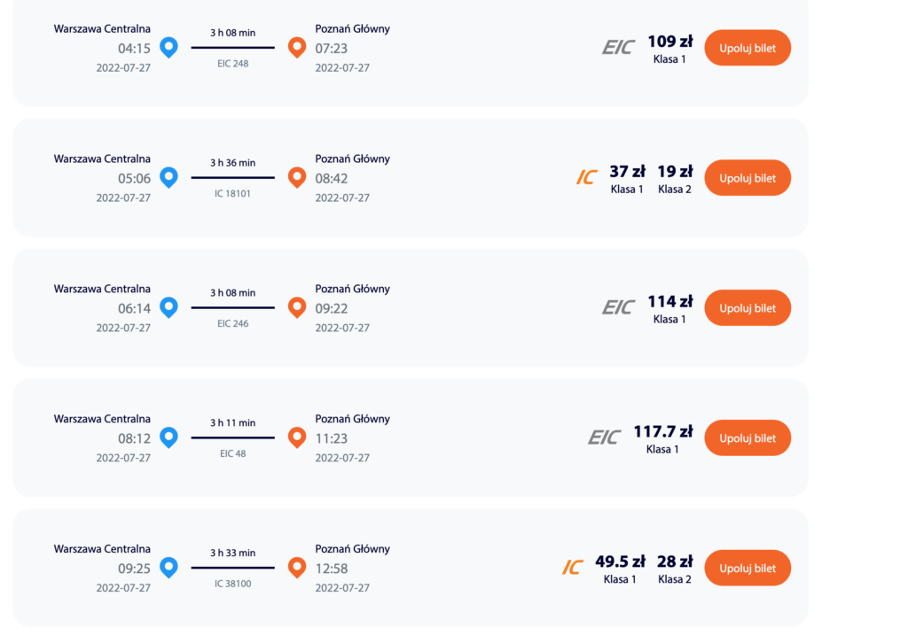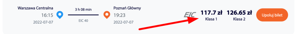 Oferty na przejazdy można kupić najkorzystniej jakieś 30 minut po północy, ale… uwaga na przerwę techniczną. Zazwyczaj jest ona wcześniej, ale pierwszego dnia każdego miesiąca trwa do 1-szej w nocy i biletów kupić się nie da. Na miesiąc przed planowaną podróżą PKP uruchamia rezerwacje (czyli dzisiaj, 27-ego czerwca można kupić bilet na końcówkę lipca ale na 31-ego lipca jeszcze nie). W praktyce, kto pierwszy ten lepszy. Ceny zaczynają się od 19 zł w klasie drugiej i 24 zł w klasie pierwszej.